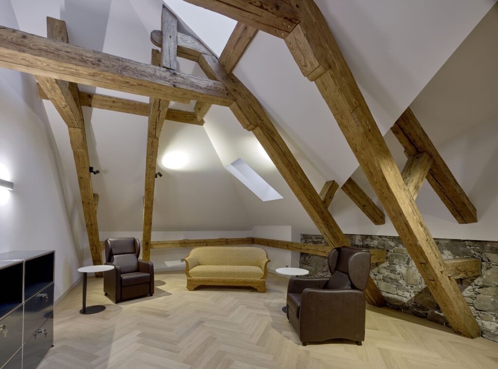 Zwischen den bestehenden Holzbalken wurden vollständig entkoppelte neue Holzdecken eingefügt, die künftig die Tragfunktion übernehmen. Durch den neuen Bodenaufbau, auf dem sich die Nutzenden bewegen, wird eine Schallübertragung wirkungsvoll unterbunden. An der alten Balkenlage sind die unteren Brand- und Schallschutzdecken sowie die haustechnischen Installationen befestigt. Das Konstruktionsprinzip ist auf Langlebigkeit und Nachhaltigkeit ausgelegt: Die einzelnen Tragwerksschichten lassen sich bei Bedarf problemlos voneinander trennen.